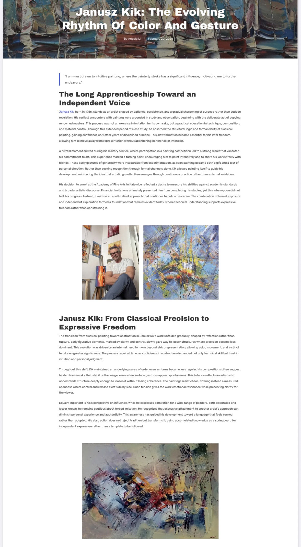 Janusz Kik, né en 1956 à Chorzow, Pologne. Il dessine depuis l'enfance, puis la peinture l'accompagne presque tous les jours. Il admirait et essayait d'imiter les grands maîtres, et ainsi il a naturellement acquis les compétences techniques de l'utilisation d'un pinceau et d'un couteau. Cependant, pour s'assurer que tout ce qu'il faisait était juste, il a rejoint l'Académie des Beaux-Arts de Katowice pendant un certain temps. Dans cette ville, il a également dirigé son propre atelier de peinture avec une petite galerie. Plus tard, il a travaillé en Allemagne et maintenant en France. Au fil du temps, son travail a évolué de la peinture classique à l'abstraction pure. Mais il revient souvent au réalisme dans ses peintures, constamment à la recherche de nouveaux défis. C'est pourquoi ses œuvres font preuve d'une grande impatience, car même en créant, de nouvelles idées sont inconsciemment créées, qui sont particulièrement visibles dans les peintures abstraites qui en résultent. Ses peintures sont vendues aux enchères d'art et font partie de nombreuses collections, pas seulement privées, sur de nombreux continents.